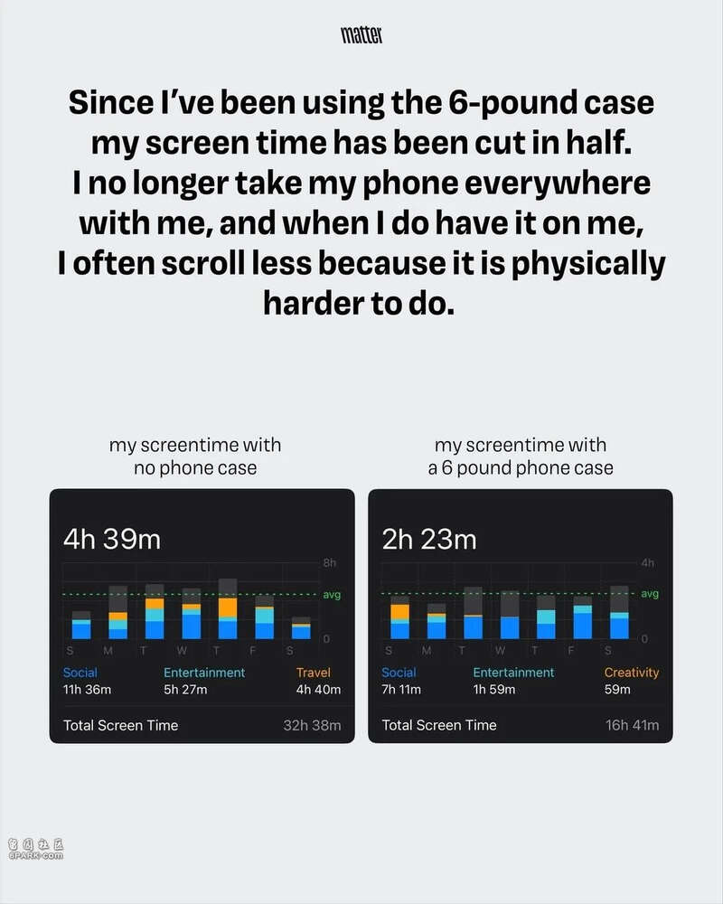 根据艾维自己的统计,这个金属手机壳让他每天减少了2-3个小时的屏幕使用时间。