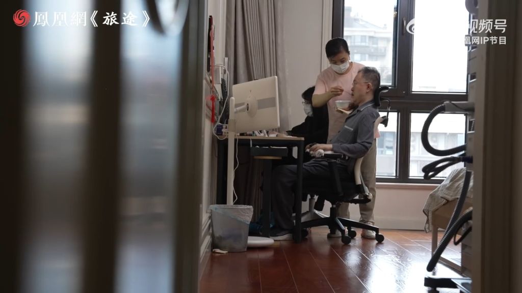蔡磊助理滢芳介绍,蔡磊起身需3人搀扶,腿部力量、颈部力量逐渐丧失,几年前双上肢已是瘫痪的状态,日常的活动范围只会在书桌前。上半年还能勉强发出几个音节,到下半年基本上已经不能再发出任何声音,只能靠眼控仪交流。