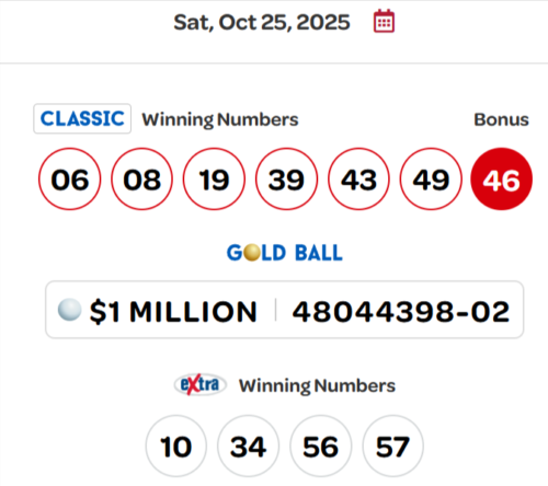 最近一期的乐透 6/49 抽奖于 10 月 25 日星期六举行。尽管没有抽出金球,但安省的一位彩票玩家匹配了中奖号码48044398-02,赢得了100万加元的白球奖。