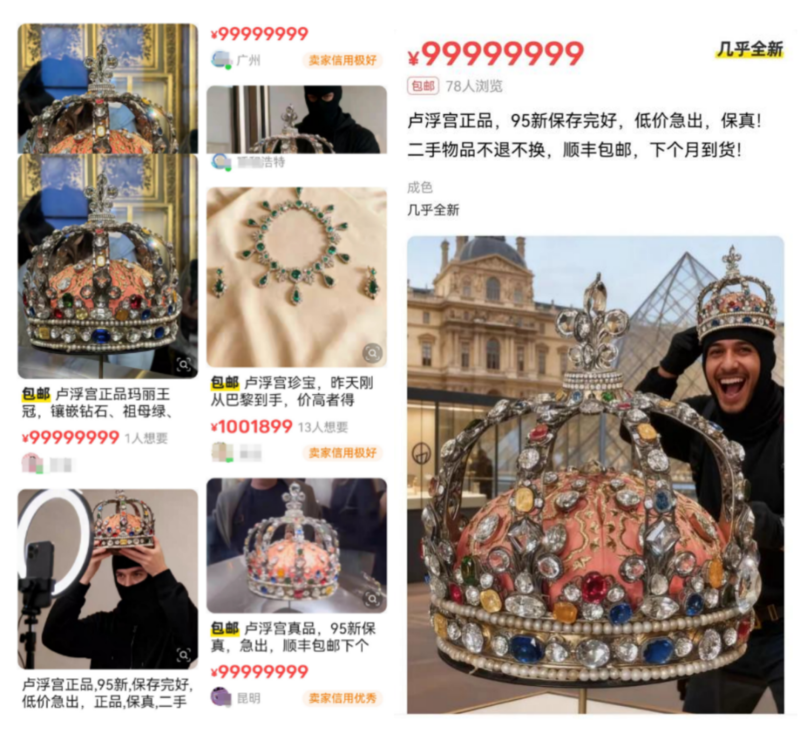 国内闲置交易平台上一夜之间冒出了许多“出赃物”的卖家,卢浮宫丢的,这里都有,什么“95新,保存完好,低价急出”、“卢浮宫珍宝,昨天刚从巴黎到手,价高者得”。