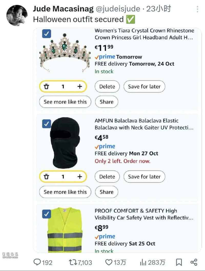 丢失的皇冠、同款面罩、同款背心,这就是今年万圣节最吸睛的穿搭,就是得小心别穿着被人摁马路牙子上了。