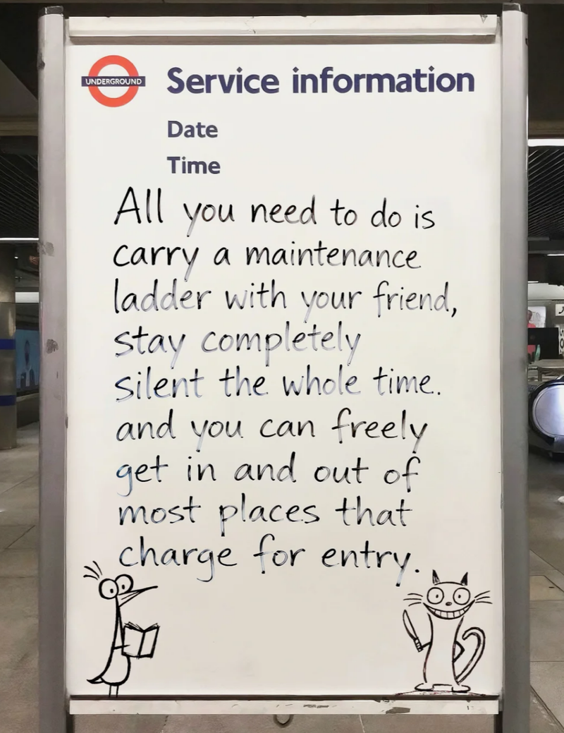 作为“全球第一法黑”的英国,事发没多久就在地铁告示栏上写了小作文:“你只需要和你朋友带一个维修梯,全程保持安静,这样就能免费去到绝大多数要收费的地方了”。