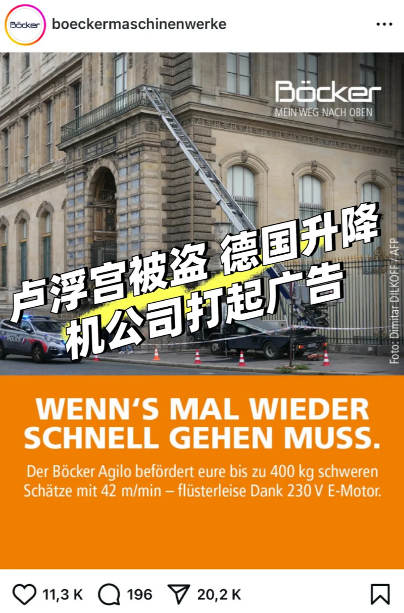 因为该品牌发现,卢浮宫盗贼使用了它们家的产品,于是给案发现场照片加上了宣传语:“B?cker Agilo 能以每分钟 42 米的速度、几乎无声地运输你们重达400公斤的宝贝,而这一切都要归功于它的230伏电动马达”。