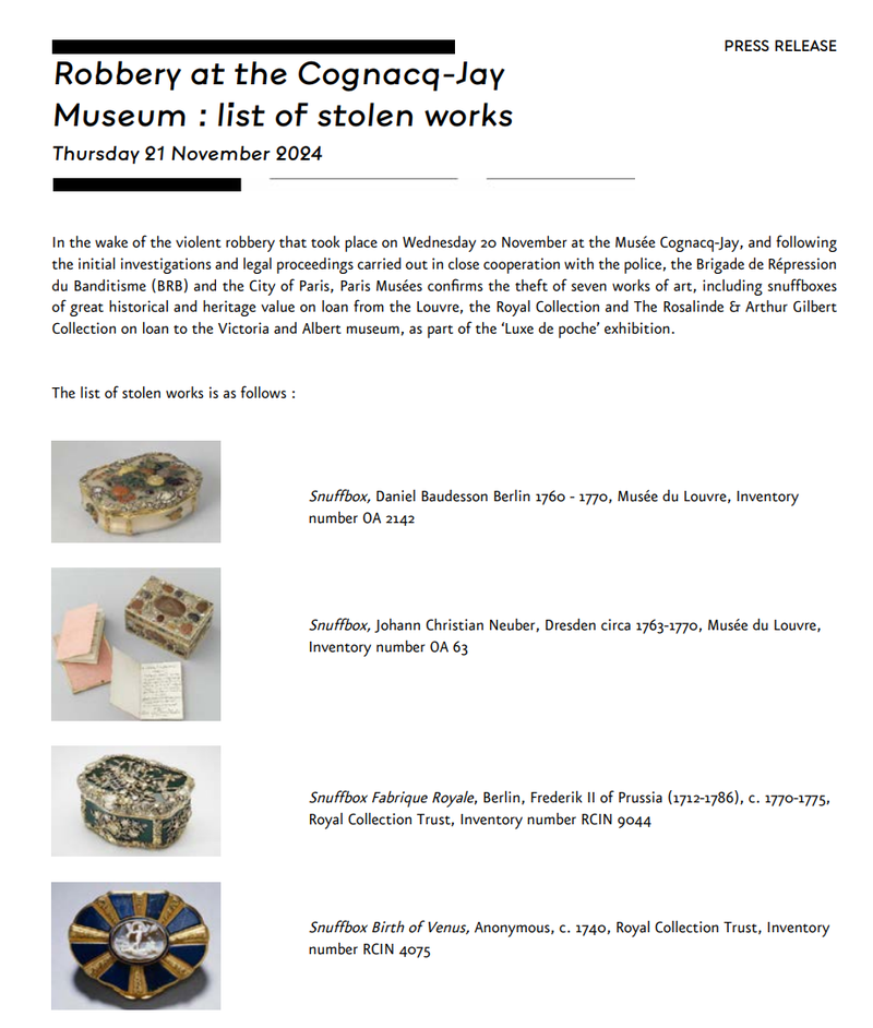 近年来,除卢浮宫之外,法国多家博物馆相继成为目标,2024年11月,巴黎的科涅克·杰博物馆(Musée Cognacq-Jay)有七件具有重大历史与文化价值的藏品被盗,虽其中五件数日后被追回,但事件依然引发广泛关注。