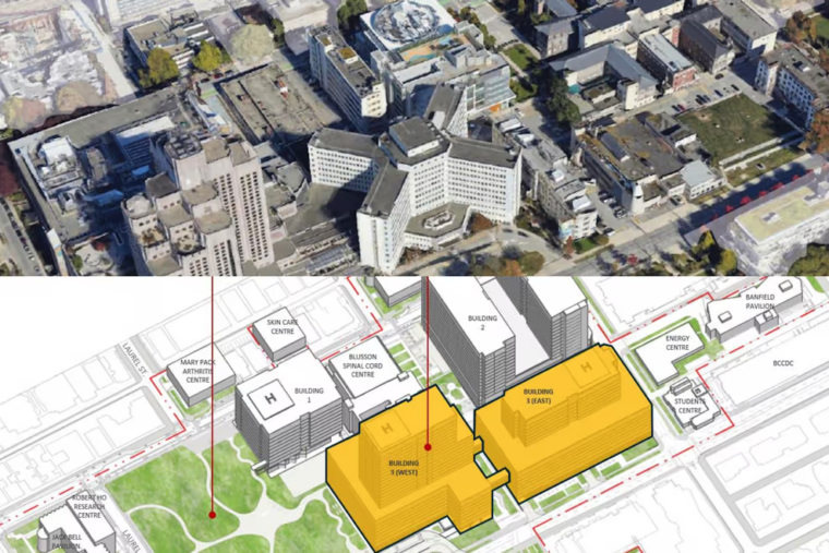 第三阶段将是迄今为止最实质性的阶段。位于Laurel Street 和 Heather Street 之间的面向西 12 大道的整个医院园区将被重新开发,包括完全拆除 1959 年建造的 Leon Judah Blackmore Pavilion(百年纪念馆)—以及 1991 年建造的吉姆·帕蒂森馆塔楼和劳雷尔馆大楼。