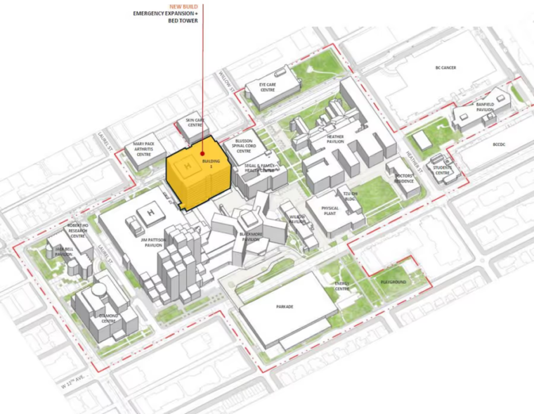 这些由桥梁连接的新建筑将取代吉姆·帕蒂森馆并增加住院床位,东楼的屋顶可能用作辅助直升机停机坪。吉姆·帕蒂森馆 (Jim Pattison Pavilion) 被拆除的巨大占地面积将暂时空置。