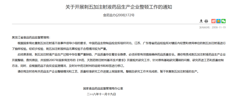 早在2008年,刺五加注射液就因生产过程存在严重安全隐患,被食药监办勒令整顿。