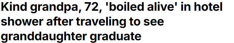 加州圣何塞发生一起离奇悲剧:一位72岁的爷爷,在美国某知名酒店洗澡时被滚烫热水“活活烫死”。