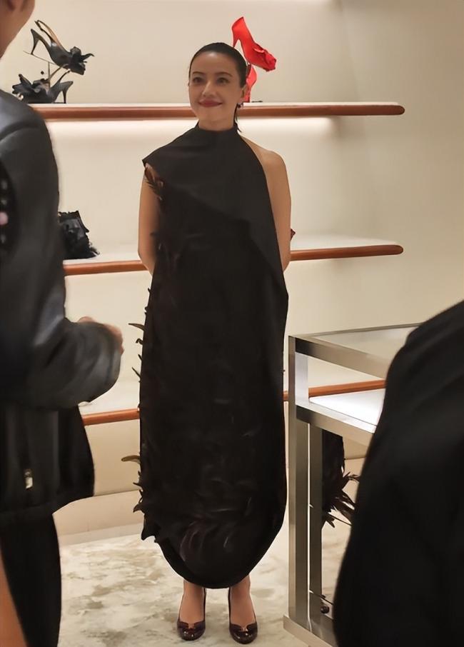 当天高圆圆穿着一件黑色挂脖礼服,礼服前面满是黑色羽毛装饰,后背则是镂空的设计,前面优雅背后性感。