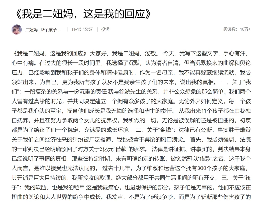 她发文讲述了与徐波的关系、金钱纠纷、孩子的相关事情。