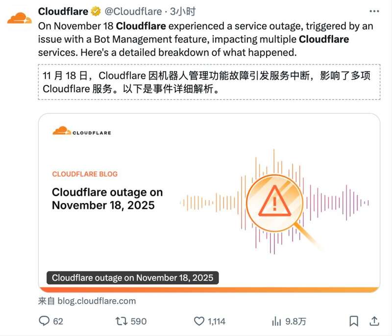 【导读】一次「常规更新」搞崩半个地球,Cloudflare CTO紧急谢罪:我们搞砸了!Cloudflare自杀式Bug引发连锁反应,波及全球20%网站。当数百万爬虫撑爆了防御名单,Cloudflare的崩溃揭示了AI时代最深的基建隐忧,人类还能跟得上AI进化的脚本吗?果然这个世界建立在脆弱性之上。昨天,2025年11月18日,全球AI数字生态系统经历了一次近乎心跳骤停般的休克。