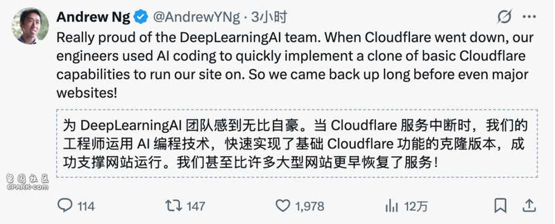 比如,吴恩达团队就在Cloudflare宕机的过程中,用AI快速实现了Cloudflare功能的克隆版本,成为最早一批恢复运行的网站。