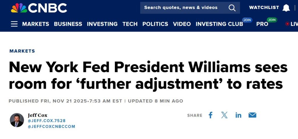 (中央社纽约(专题)21日综合外电报导)美国纽约联邦准备银行总裁威廉斯(John Williams)今天表示,他认为联准会「近期」仍有降息空间。