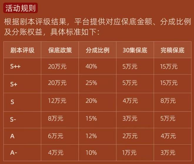 具体而言,新政策调整了保底和分成比例,最高保底20万元,最高分成比例则提升至40%。而红果的这一举措,其目的是想打破以往相对平均化的分配模式,让优秀的创作者得到更丰厚的收益。