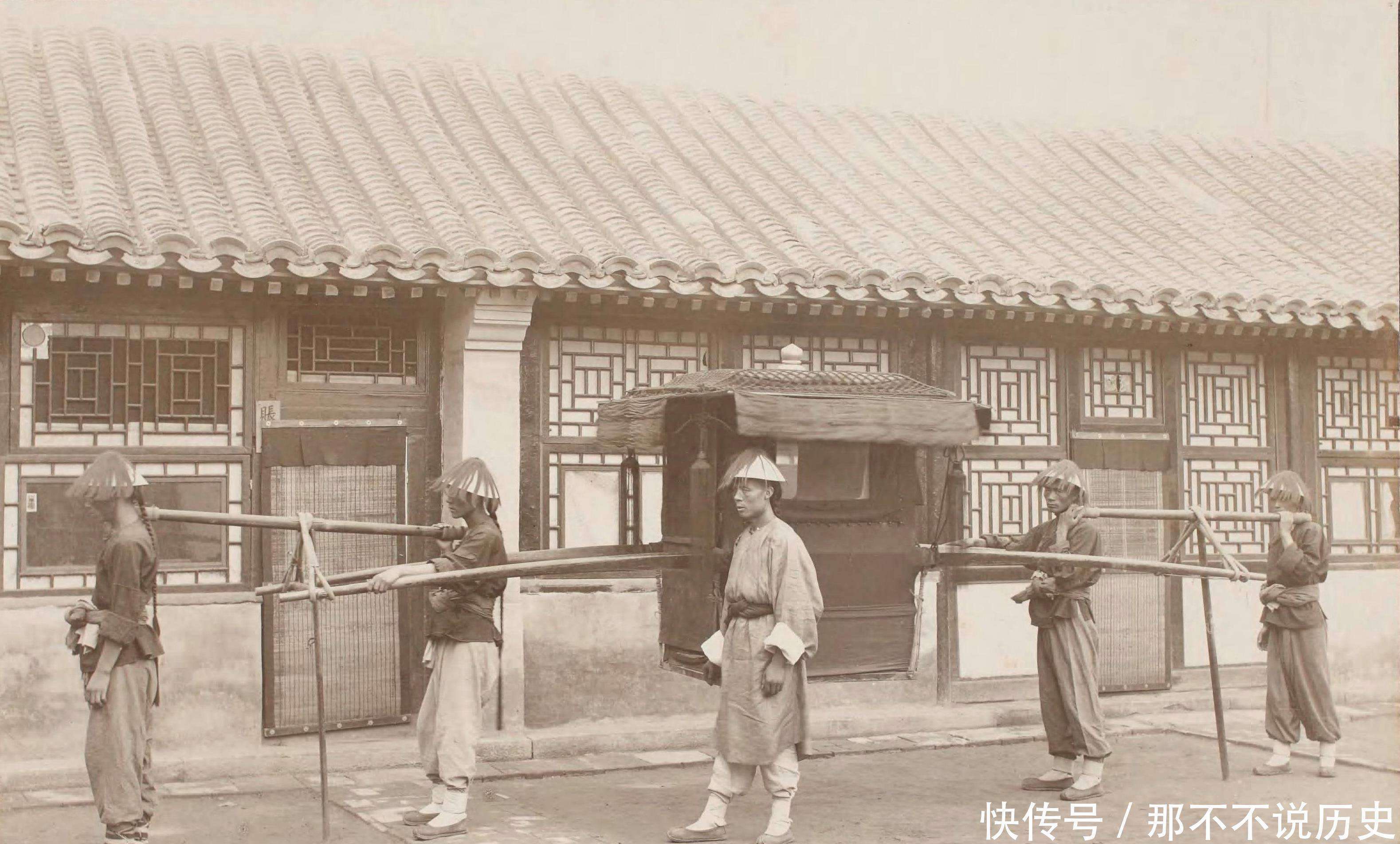 接下来的照片则是轿子的场景。这是当官的大老爷们使用的出行工具。轿子是四个人抬着的,抬轿子的人叫做轿夫,轿夫的数量通常与坐在里面的人官职的大小有关,轿夫越多,官员的身份和地位也就越高,象征着更多的面子。