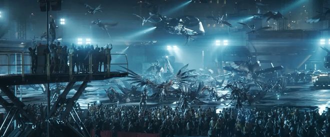 后面的结尾果不其然拥有着近1小时的动作戏,几条线并行中,但杂而不乱,共同推向最后的高潮。整个场面显然是系列最佳,就观感来看,自然要比第二部场面更大,但较第一部相比并未有太多的突破,更多原因还是当年《阿凡达》作为开拓者,呈现出了太多的原创性的震撼,有一种先入为主的印象分。