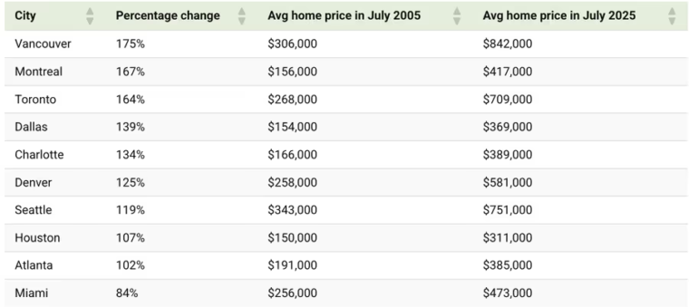 報告顯示2005年7月溫哥華的平均房價為306,000美元,到2025年7月大幅上漲至842,000美元。