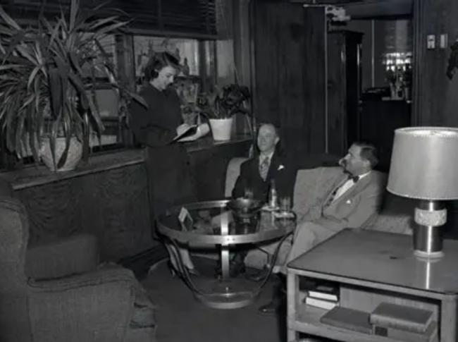 这个贵宾室本身很舒适:低矮的天花板、灯具、蓝色地毯("旗舰蓝")和红色皮扶手椅。"这是男人喜欢,但女人也会感到自在的那种房间,"一份公司宣传册声称。它由一位被称为"船长"的年轻女性管理,并隐藏在机场内;你需要按门铃,然后进去后可以打桥牌,或者也许发个电报。在华盛顿国家机场,海军上将们会在周日过来,没有航班,只是为了喝酒。