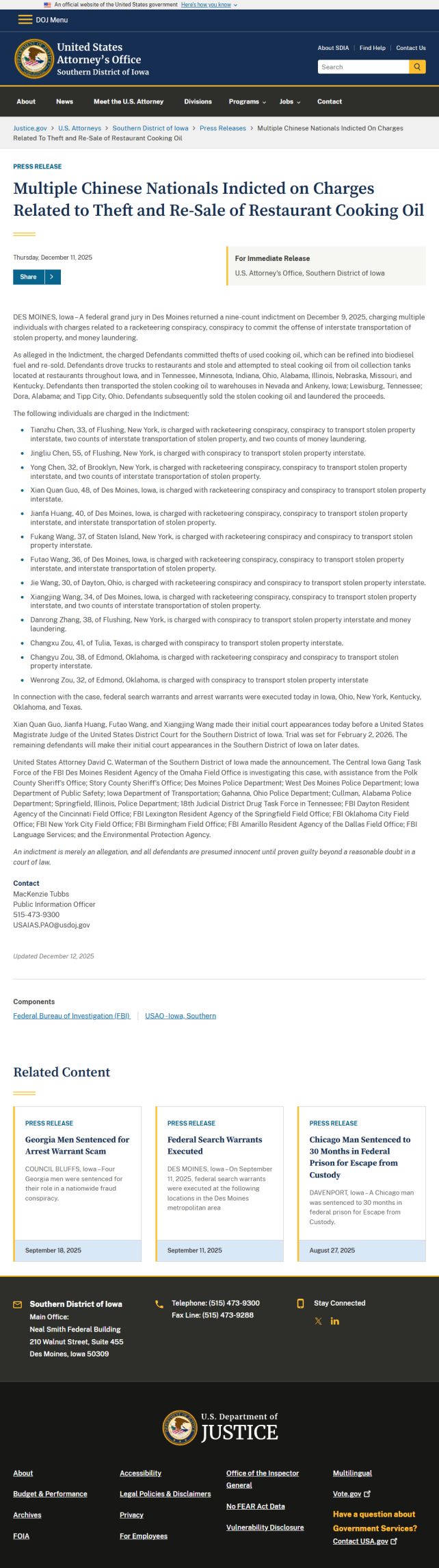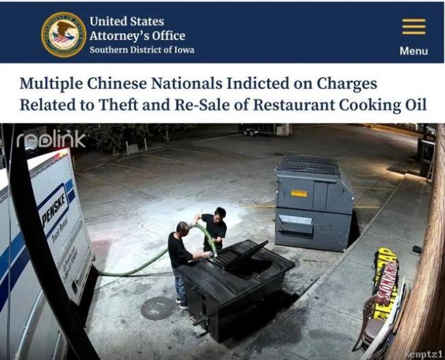 根据联邦起诉书披露,该团伙被指控系统性地从多州餐馆非法盗取废弃食用油,并通过复杂的跨州物流和资金流转网络,将赃物出售牟利。据了解,这些废弃食用油并不是用来提炼成食用油,而是用来提炼生物柴油,在能源市场具有较高经济价值。