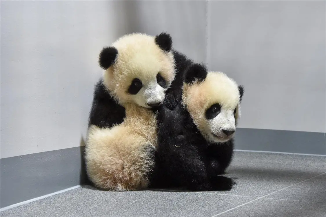 2021年12月13日大熊猫幼崽“蕾蕾”(前)和“晓晓”(后)(图片来源:新华社)