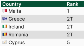 排名第一的是马耳他。希腊、爱尔兰和罗马尼亚 并列第二。