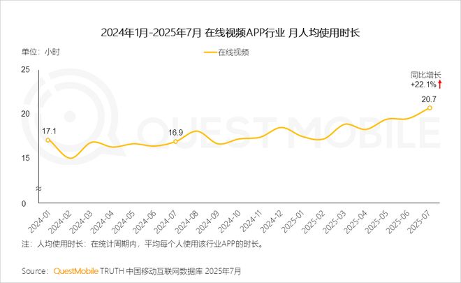 就在《盛夏芬德拉》出圈之後沒多久,11月4日,QuestMobile發布了2025中國移動互聯網秋季大報告,報告顯示,中國網民觀看在線視頻的人均使用時長壹直在強勢增長: