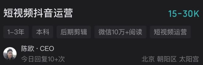 後來陳歐又開始投資影視劇,做短視頻,有人在boss直聘上看到他壹天回復拾個求職者問題。