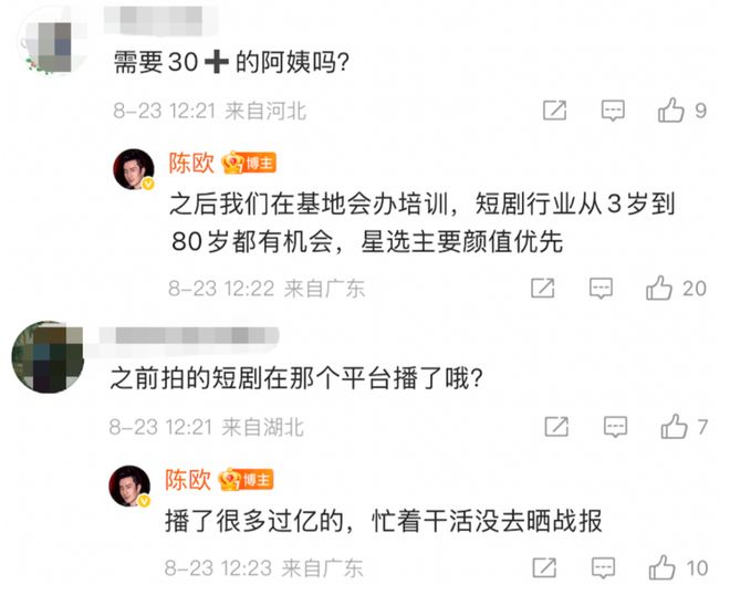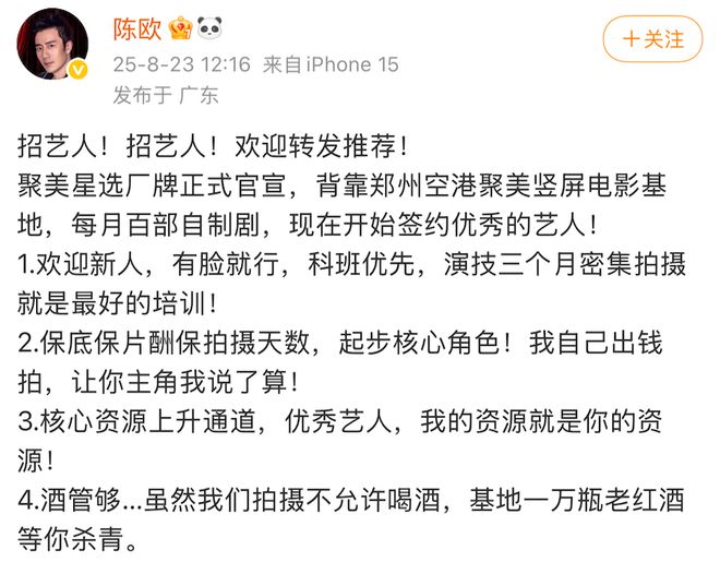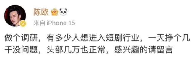 陳歐本人還不滿足於此,他成立了壹家影視公司,也開始簽約新演員,投拍短劇,准備自己孵化短劇巨星。