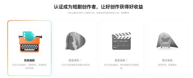 如果你要去注冊,它會讓你首先選擇身份,有編劇,演員和承制,以後還會有更多角色: