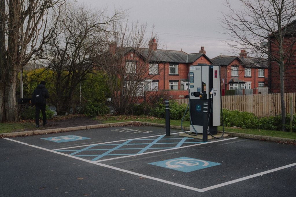 利兹停车场内的电动汽车充电站。作为全球最大的汽车出口国,中国同时也是最大的电动汽车制造国。 OWEN RICHARDS FOR THE NEW YORK TIMES