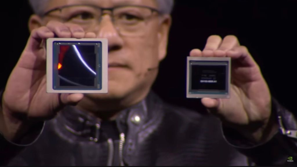 黄仁勋在辉达GTC的大会介绍Blackwell(左)与前代的Hopper芯片(右)。(翻摄辉达GTC大会直播影片)