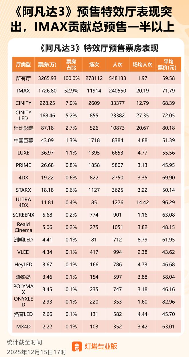 12月15日,影片公映前夕,灯塔专业版曾公布一组特效厅预售数据。截至当日17时,《阿凡达3》总预售票房约为3265.93万元,特效厅的表现极其突出。