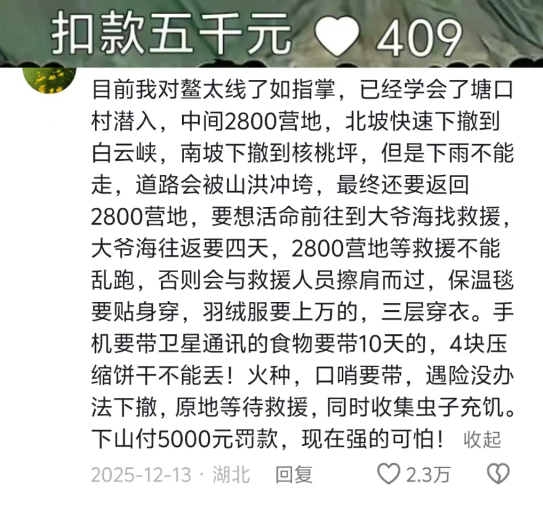 在许多鳌太线相关视频内,登山经验为0的网友们也能说出登山的点位名称,山顶一些驴友的葬身处被称为“万神殿”,而下山时被抓住罚款则被戏称为“下山付5000元门票”。