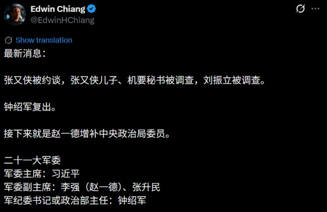 在海外X上,已流传诸多有关张又侠和刘振立的负面消息,有账号爆料称“二十大两名军委副主席,胜利实现了会师”,并配发了张又侠与已落马的何卫东的照片。但也有网民表示,“张又侠出事?无法考证,但概率极低。”