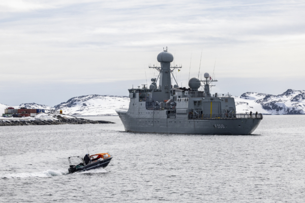 2025年5月4日,一艘丹麦王家海军船只准备停靠格陵兰首都努克市(Nuuk)。(John Fredricks/英文大纪元)