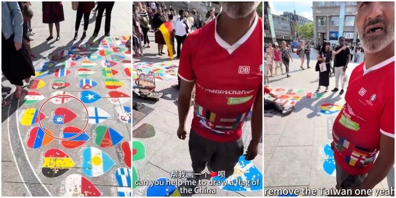 有網友10日轉發抖音影片,壹名中國男子在德國科隆大教堂(Cologne Cathedral)外面看到,有街頭畫家在地上畫了心形的各國旗,吸引不少觀光客尋找自己國家的國旗合影。中國男子上前湊熱鬧,可找了半天沒找到中國國旗,反倒是“礙眼”的台灣國旗先找到。他馬上找畫家抗議,要求馬上補畫伍星旗,但畫家比出4的手勢說,付費40歐元就能給他畫壹個大大的伍星紅旗,中國男子覺得太貴,詢問能否畫小的20歐元就好?畫家也相當懂話術,反將壹軍說,“小的顯不出重要性,這樣不尊重”。