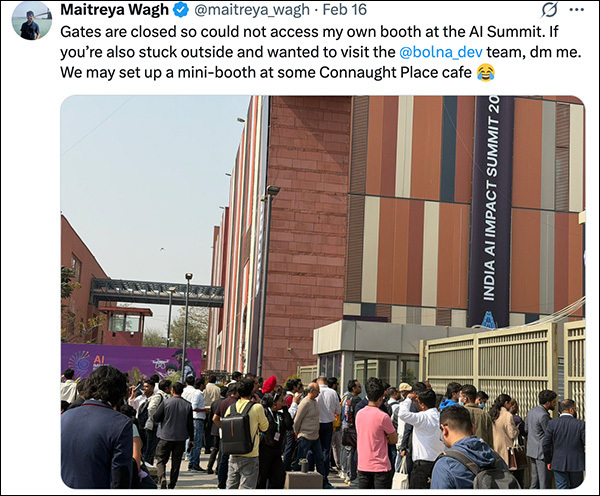 智能语音初创公司Bolna联合创始人霍格在社交平台X上表示,展厅大门关闭后,他无法进入自家公司展台。科技平台Reskill创始人贾殷描述称,早上7时场馆就开始排队,随后是数小时的等待,以及“全面疏散”,直到莫迪抵达。