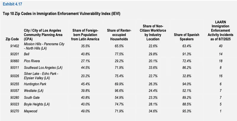 这份名为《ECONOMIC IMPACTS OFFEDERAL IMMIGRATIONENFORCEMENT IN LOS ANGELES COUNTY》报告指出,ICE执法行动并非均匀分布在整个城市范围,而是集中在一些以移民人口为主、经济较为脆弱的社区。
