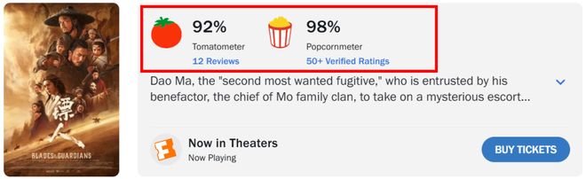 更重要的是,《镖人》的海外口碑已经出炉,烂番茄新鲜度92%,爆米花接近满分,高达98%,IMDB也给出了7.4分。