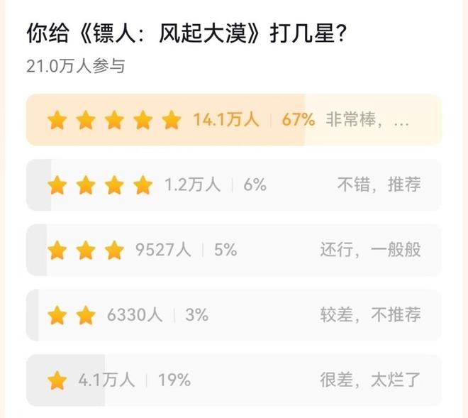 某平台做了一个观众调查评分,21万人参与打分,五星和四星占比高达73%,自来水效应彻底爆发。