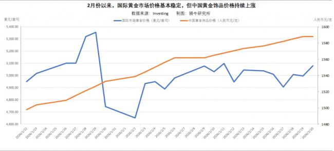 一、春节期间国际市场黄金价格基本稳定,但国内黄金饰品价格大幅上涨。