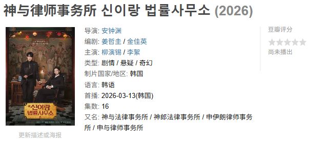 柳演锡与李絮组成的驱魔律政搭档。既有法庭上的唇枪舌剑,又有替亡者伸冤的奇幻色彩。单元剧形式让故事推进利落,融合惊悚悬疑与轻松搞笑,有望为沉闷的律政题材注入新活力。