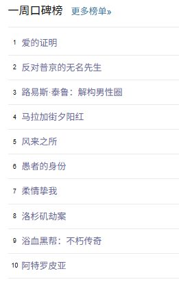 最后,还是例行附上一周豆瓣口碑榜的完整榜单: