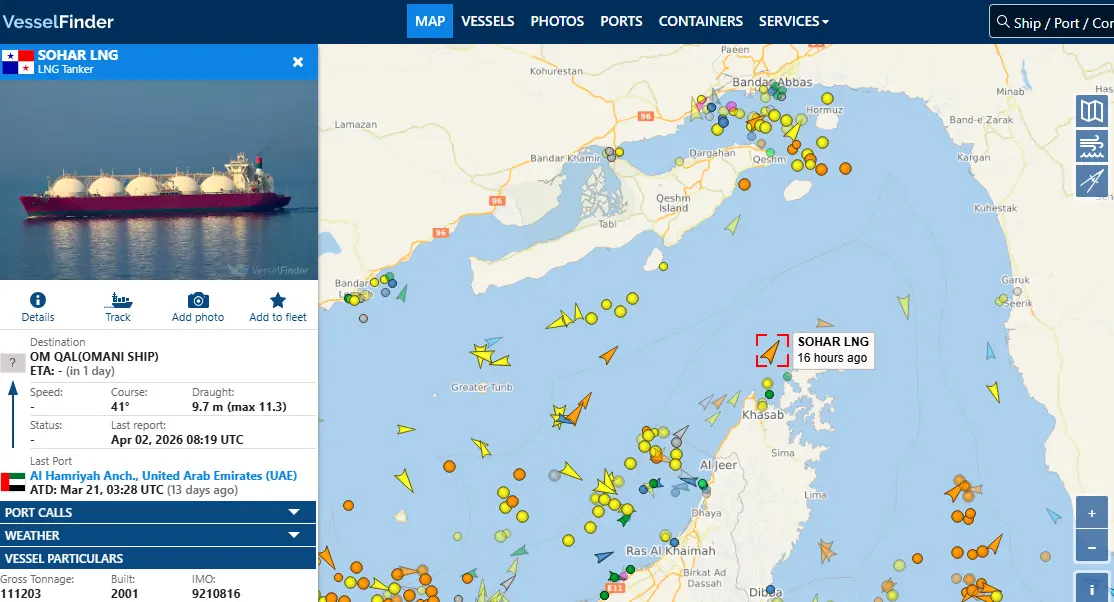 船舶追踪数据显示,这艘名为“索哈尔”(Sohar)号的液化天然气运输船似乎未载货,在将目的地改为阿曼的卡尔哈特液化天然气出口终端后,正向东航行。数据显示,这艘显示为阿曼籍的船只在过去一个月里一直在波斯湾附近徘徊。