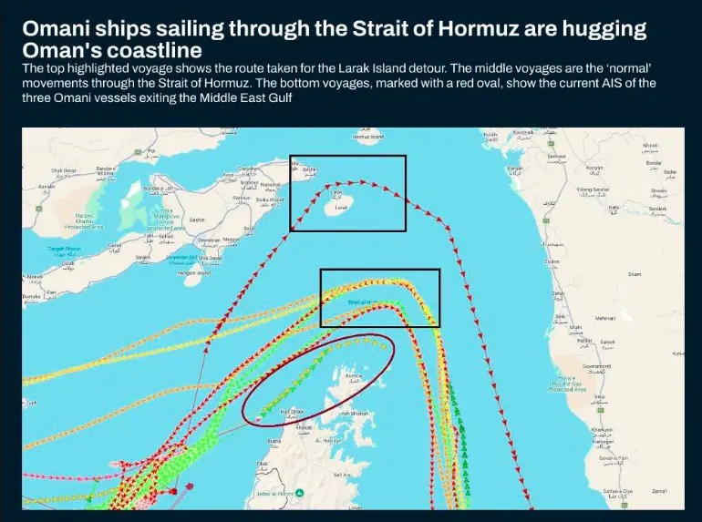 分析人士还指出,更重要的是,“索哈尔”号似乎正在穿越海峡的“南线”(紧贴阿曼海岸线),这很不寻常——因为船只通常会根据伊朗的要求采取走“北线”——即穿越伊朗拉腊克岛与格什姆岛之间的航道。换句话说,这艘阿曼船只似乎正在“冒险突围”。