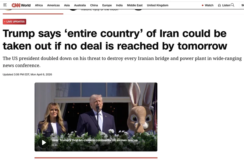当地时间4月6日,美国总统特朗普就对伊朗战事举行新闻发布会。特朗普表示,伊朗整个国家甚至可能在一夜之间被彻底击溃,而那一夜,或许就是4月7日晚。