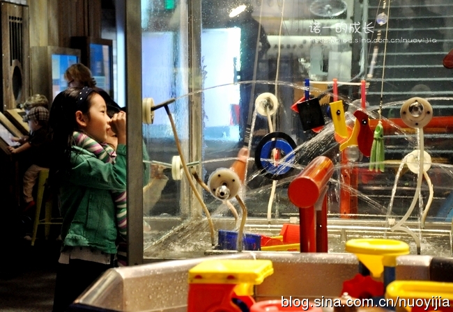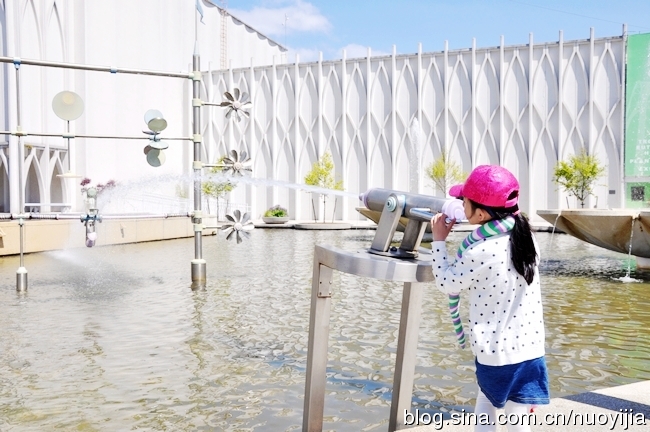 又回到了室外,在中央广场上设计了一组与水有关的、参与性极强的科技展品,造型美观,大人孩子都爱参与——