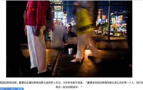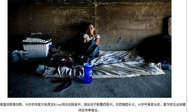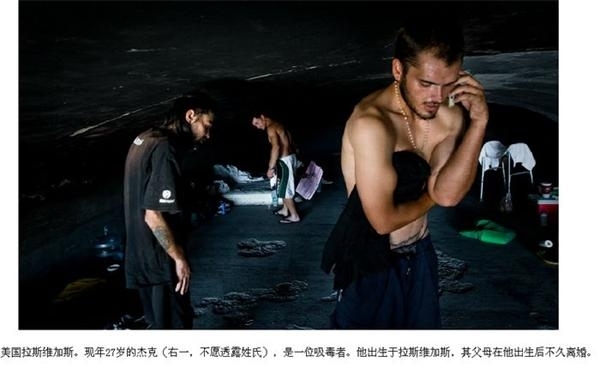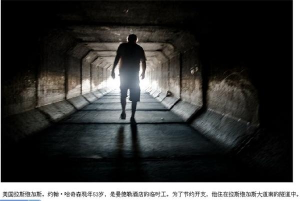 美国拉斯维加斯。傍晚的拉斯维加斯。右边是拉斯维加斯大道。 拉斯维加斯素以“不夜城”著称。然而,对于濒临绝望的边缘人来说,这里却成了不折不扣的“人间炼狱”。或许这座“罪恶之都”不愿承认,经济危机导致越来越多的人流离失所,寄住在原本用作排水渠的地下隧道里。 豪华赌城下方布满了500英里的隧道,当中挤满了形形色色的无家可归者。孤独的长者,消沉的少年,拮据的年轻母亲,疾病缠身的人,吸毒酗酒的人,退伍老兵,还有嗜赌如命的赌徒……隧道为这些身份不明的人提供了避难所。