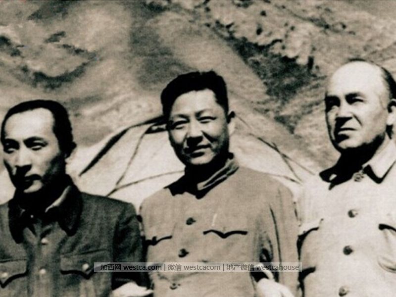 1952年7月,习仲勋受中共委派,到新疆成功处理了乌斯蛮叛乱事件。图为习仲勋(中)与新疆人民政府主席包尔汉(右)、副主席福鼎·艾则孜合影。