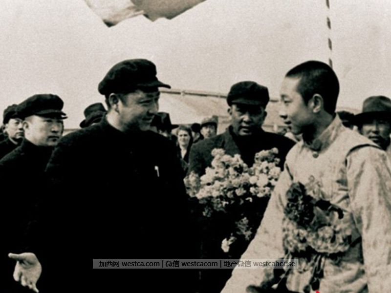 1951年4月22日,习仲勋(前左)率领西北军政代表欢迎途经西安赴北京的班禅额尔德尼·确吉坚赞(前右)。